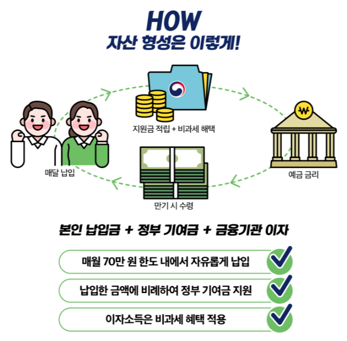 청년 도약 계좌는 만 5년이 되는 날 '납입한 원금 + 정부 기여금 + 은행 금리' 를 더해서 돌려주는 상품 입니다. 특히 은행 금리같은 경우 원래는 금융 소득세가 적용되어 과세 대상이지만 청년도약계좌 상품은 금리에 대해 비과세 혜택이 있다고 합니다.